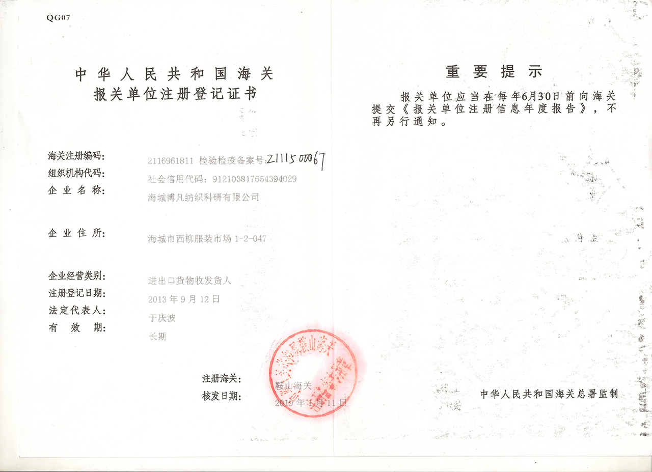 中華人民共和國海關(guān)報關(guān)單位注冊登記證書 |